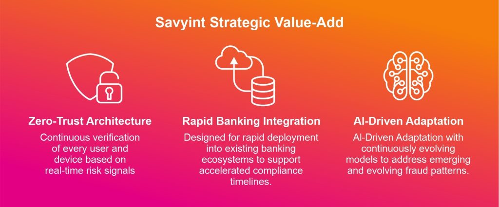 Understanding the regulatory and operational challenges faced by banks and financial institutions, Savyint delivers an integrated security and fraud prevention platform aligned with AFASA and BSP Circulars 1213 – 1215. The solution is built around four core pillars: Cyber Security & App Protection, SCA/MFA Identity, AI-Driven Fraud Management (FMS), and Risk Management & Compliance, protecting the entire customer journey – from onboarding and login to authentication, transaction execution, and post-transaction monitoring.
